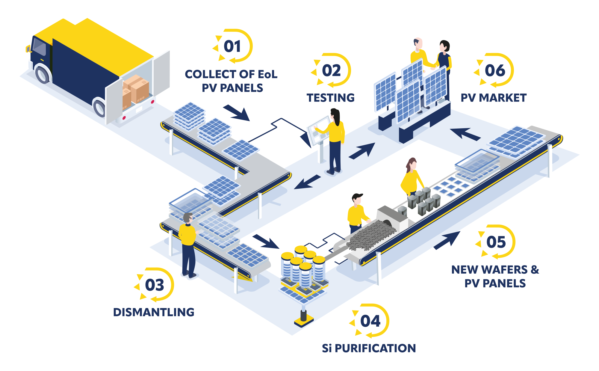 The project will demonstrate the technical, economic and environmental viability of the entire recycling process and deliver the design of an optimised turnkey recycling factory for end-of-life PV panels, paving the way for European industrial mass production of recycled silicon.
